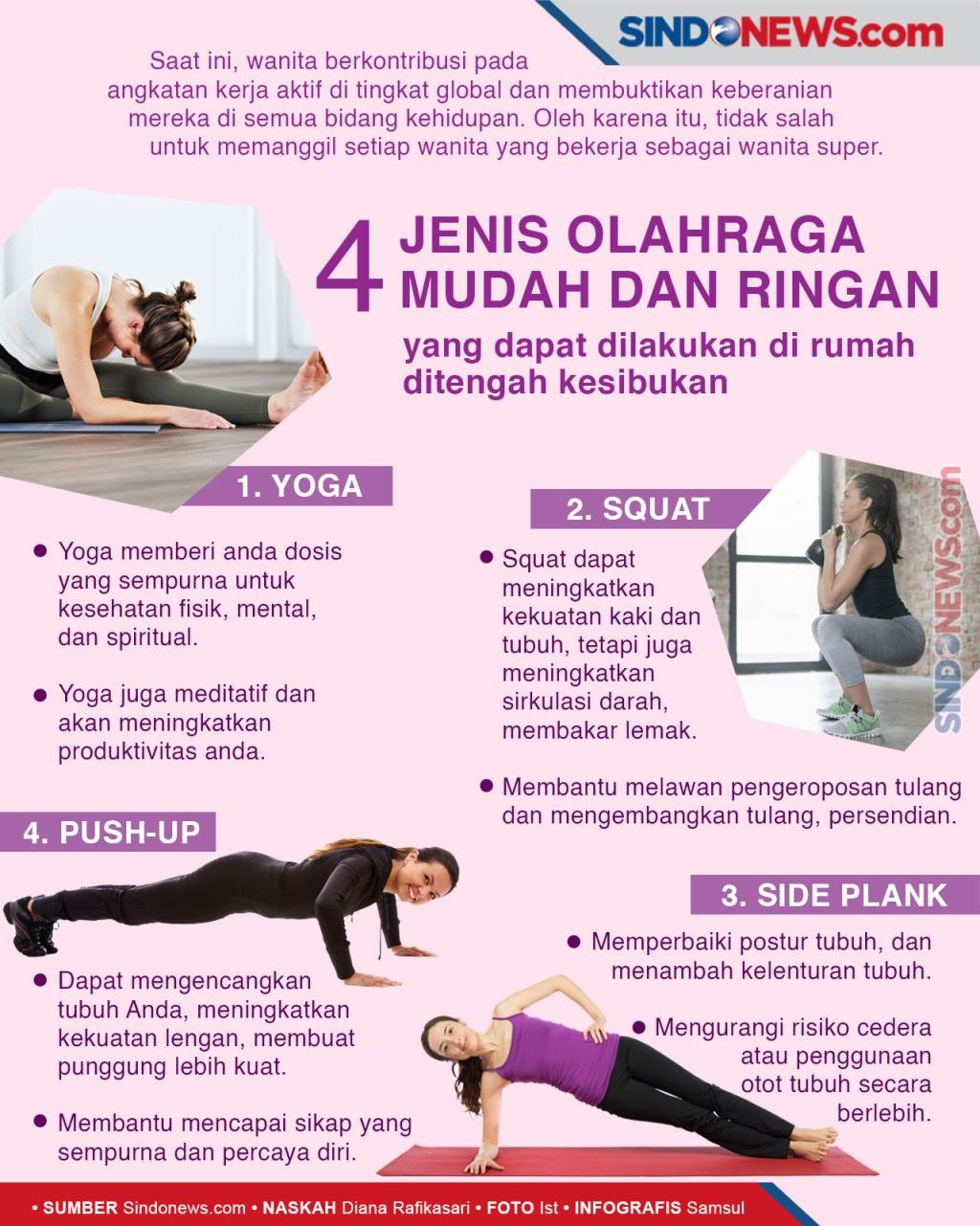 - Yoga: Yoga adalah latihan yang menggabungkan gerakan fisik, pernapasan, dan meditasi. Yoga membantu meningkatkan fleksibilitas, kekuatan, dan keseimbangan tubuh.