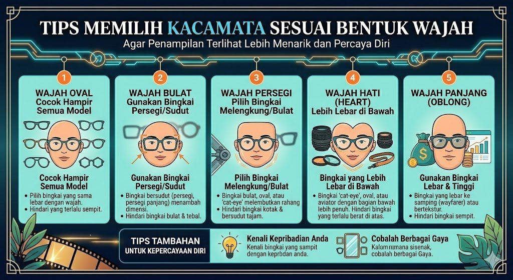 Prinsip utama dalam memilih kacamata adalah mencari kontras. Bagi pemilik wajah bulat, pilihlah bingkai yang memiliki sudut tajam dan tegas seperti model persegi atau wayfarer. Sudut-sudut ini akan memberikan dimensi pada wajah, membuatnya terlihat lebih panjang dan tirus. Hindari bingkai berbentuk bulat karena akan semakin mempertegas kelengkungan wajah. Sebaliknya, bagi pemilik wajah kotak yang memiliki fitur garis rahang sangat kuat, pilihlah bingkai dengan bentuk melengkung, oval, atau bulat. Bingkai yang lembut akan membantu menyamarkan ketajaman sudut rahang dan memberikan kesan wajah yang lebih luwes serta bersahabat.